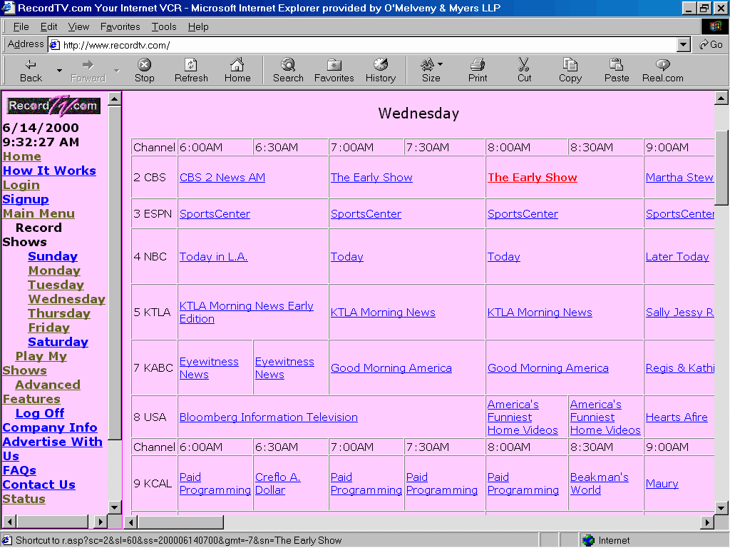 METRO-GOLDWYN-MAYER STUDIOS INC., a Delaware corporation; DISNEY ENTERPRISES, INC., a Delaware corporation; TWENTIETH CENTURY FOX FILM CORPORATION, a Delaware corporation; COLUMBIA PICTURES INDUSTRIES, INC., a Delaware corporation; CPT HOLDINGS, INC., a Delaware corporation; COLUMBIA PICTURES TELEVISION, INC., a Delaware corporation; TRISTAR TELEVISION, INC., a Delaware corporation; TRISTAR PICTURES, INC., a Delaware corporation; ELP COMMUNICATIONS, a California partnership; PARAMOUNT PICTURES CORPORATION, a Delaware corporation; UNIVERSAL CITY STUDIOS, INC., a Delaware corporation; TIME WARNER ENTERTAINMENT COMPANY, L.P., a Delaware limited partnership, Plaintiffs, v. RECORDTV.COM, a California corporation; DAVID SIMON, an individual; and DOES 1 through 10, Defendants. |
